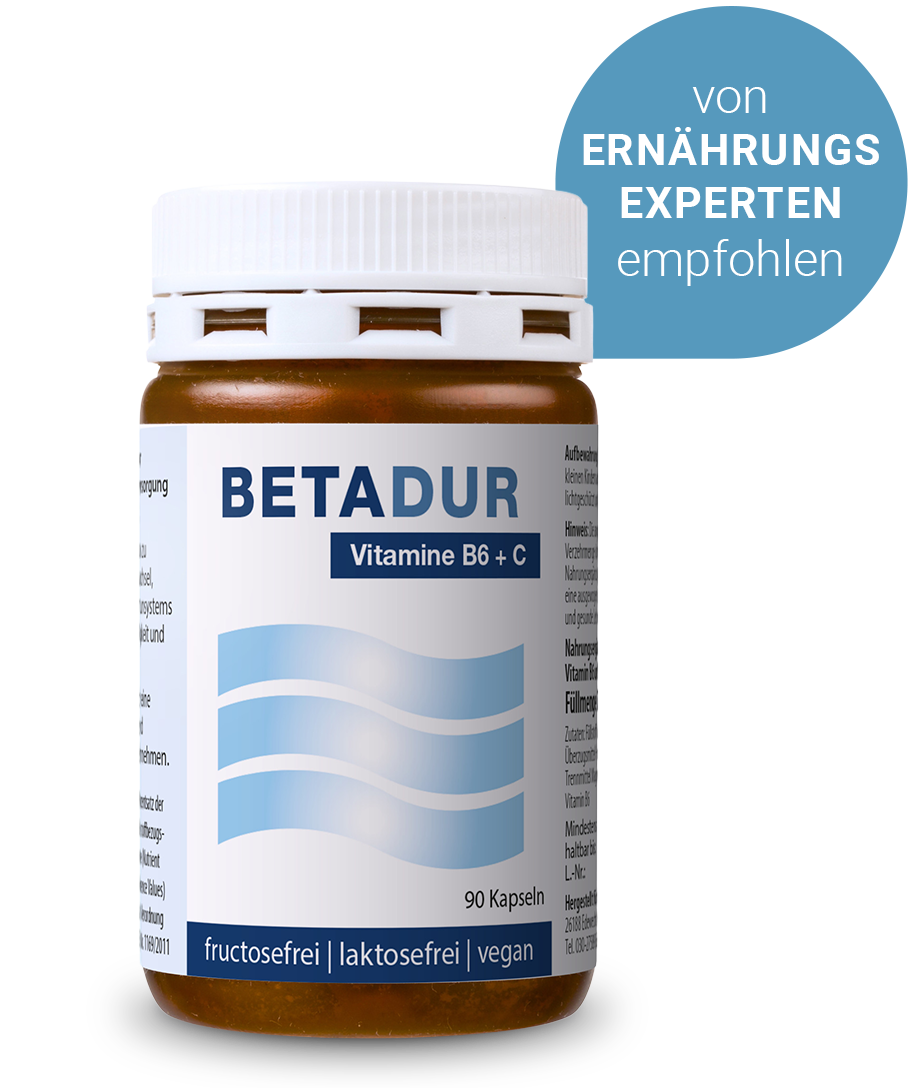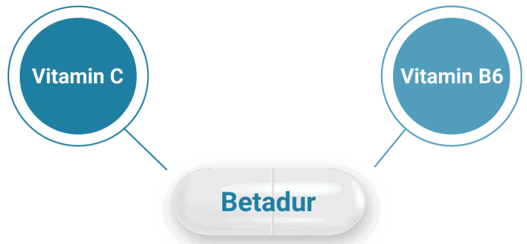 Betadur© Kapseln sind ein einzigartiges Kombipräparat mit einer 2-Fach Formulierung aus den Vitaminen B6 und C