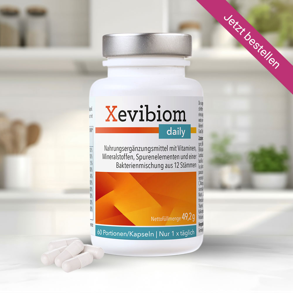 Xevibiom© daily enthält eine Bakterienmischung aus 12 der prominentesten Stämme in einer hohen Konzentration von 6,0 Milliarden Kolonie-bildenden Einheiten (KbE) pro Tag.